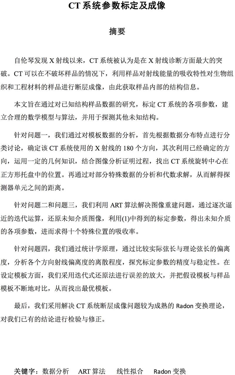 - 具体的数值结果一般不出现在常规摘要中,因为每一个数值结果可能都会依赖大量的假设和具体的输入数据,而在摘要中无法展示这些假设和数据,孤零零一个数字,没有前因后果,写了读者也看不懂,不如不写。竞赛论文不同,竞赛题目中如果给定了实验数据,那么所有参赛队都是使用相同的数据开展研究工作,可以在摘要中展示重要的计算结果。仍以2017年全国赛A题为例,第一问明确要求参赛队求出结果的物理量有旋转中心位置、探测器单元间的距离、180个射线方向。中心位置是一个坐标,单元间的距离是一个数值,都可以在摘要中直接写出来,也应该写出来。180个方向如果有规律,比如等差数列,就写清楚首项和公差,如果没有规律,可以描述整体规律,或者是罗列前几项和最后几项。第二问、第三问要求给出10个位置处的吸收率,可以分别罗列,或者是列一个简单的表格(尽量不列表格)。